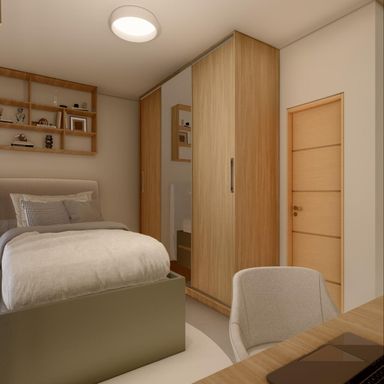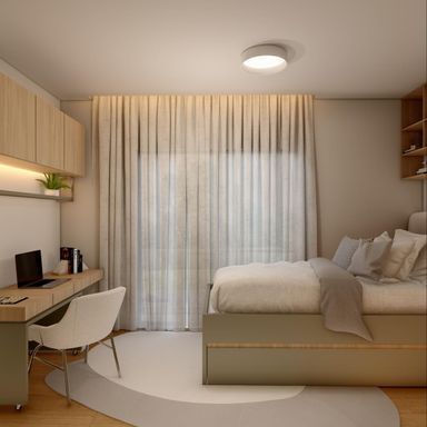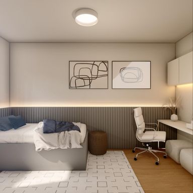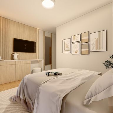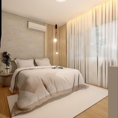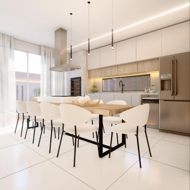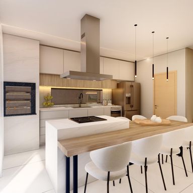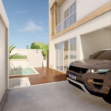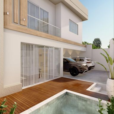 Pensada para unir conforto e funcionalidade. O projeto conta com três suítes — sendo a principal com closet e varanda — além de sala de estar, cozinha, área de serviço e área gourmet integrada à piscina. Com duas vagas de garagem, os ambientes foram planejados para proporcionar praticidade e momentos especiais em família.